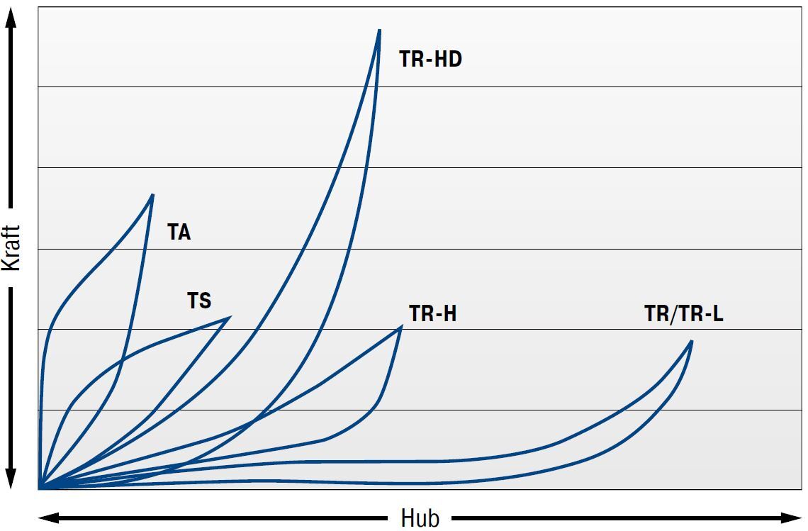 Progressive Kennlinie mit hoher Kraftaufnahme bei geringem Hub.