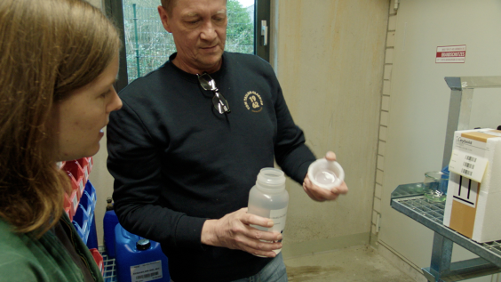 Ihr Weg führt zu Heiner Tapken von der ACE Stoßdämpfer GmbH, der ihr die Funktionsweise von Rotationsbremsen und deren Dämpferflüssigkeiten näherbringt.